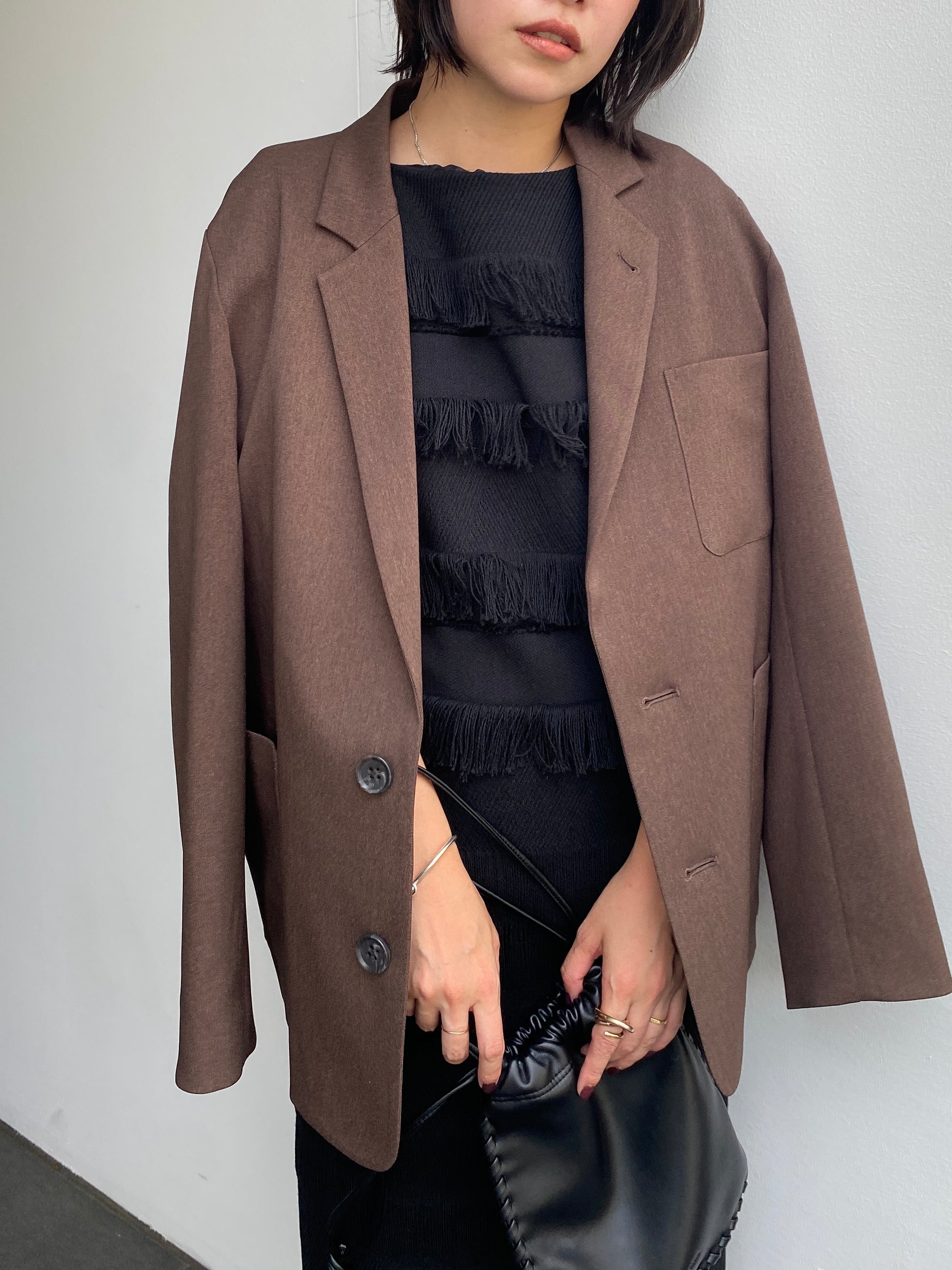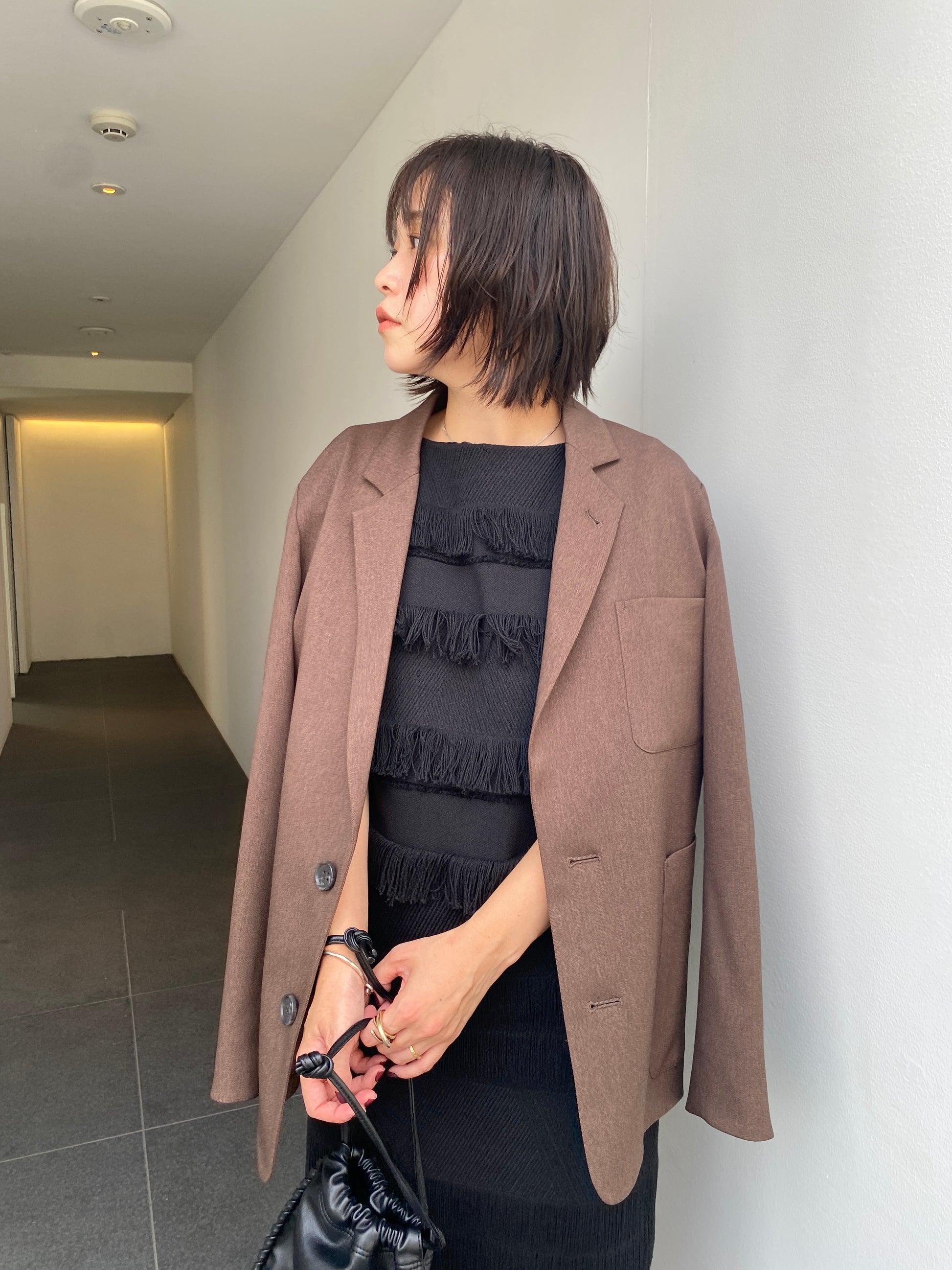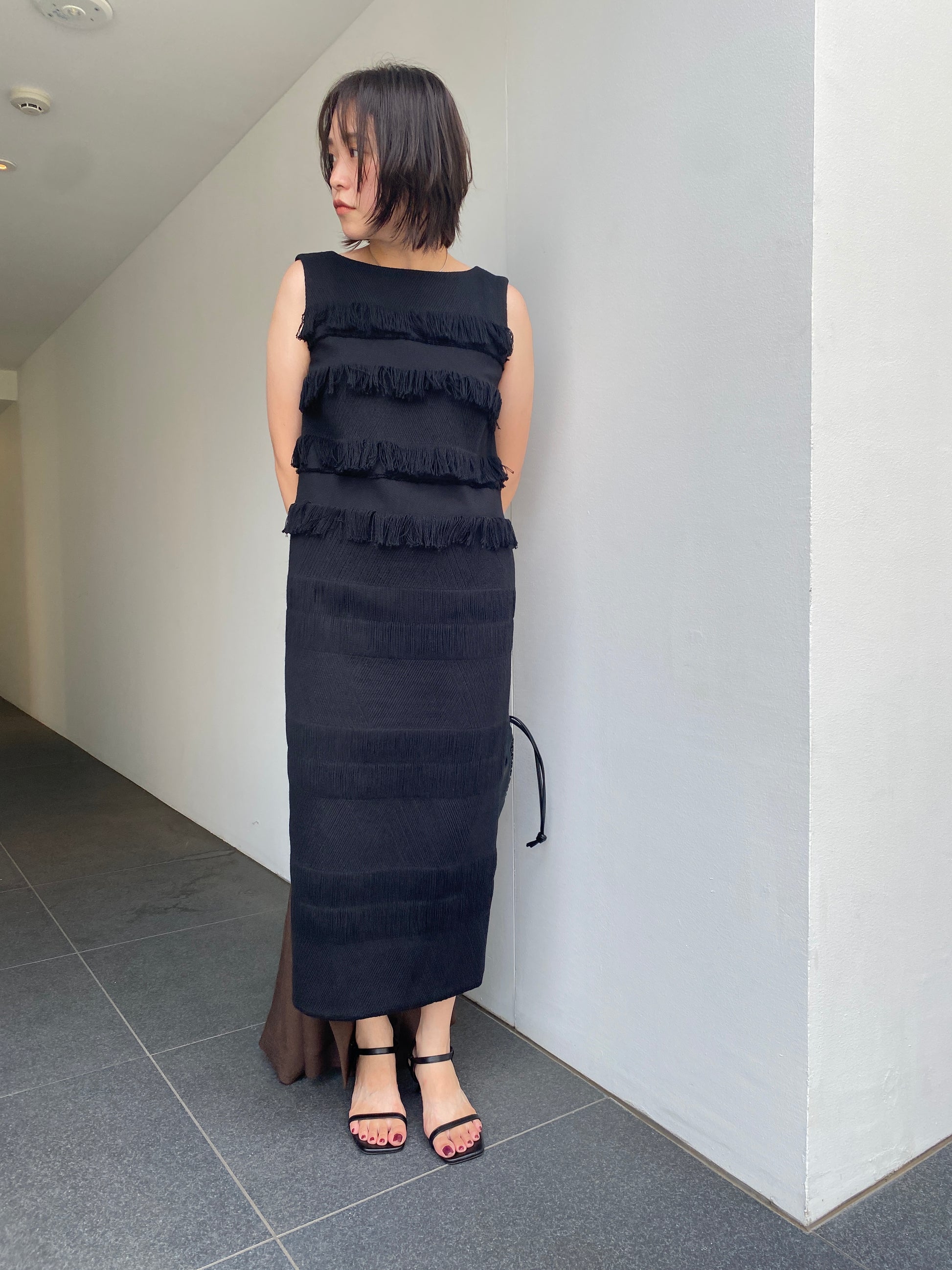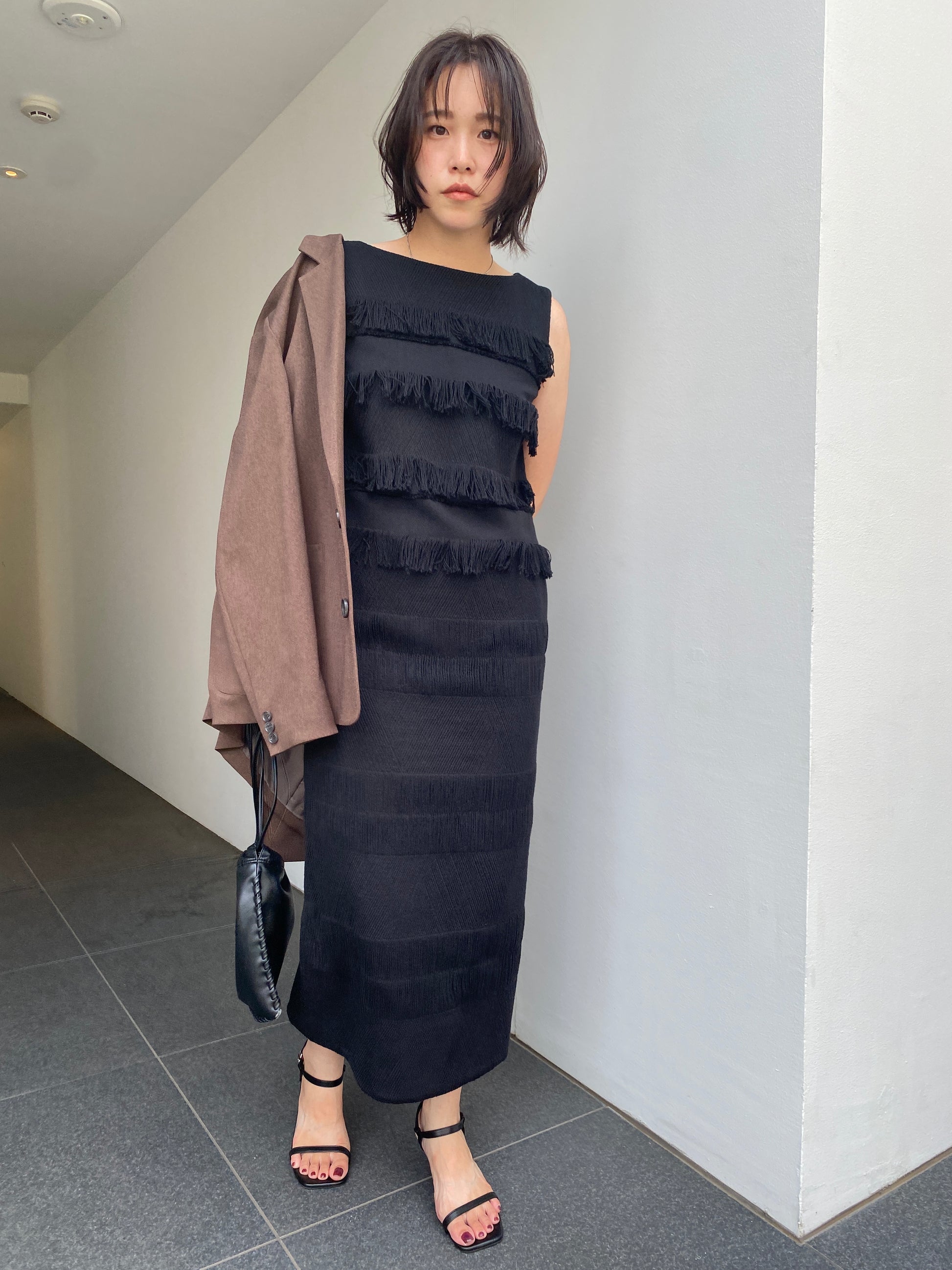 フリンジの立体感と、縦に落ちる美しいラインが印象的で、シンプルながらも一枚で華やかさを演出します。