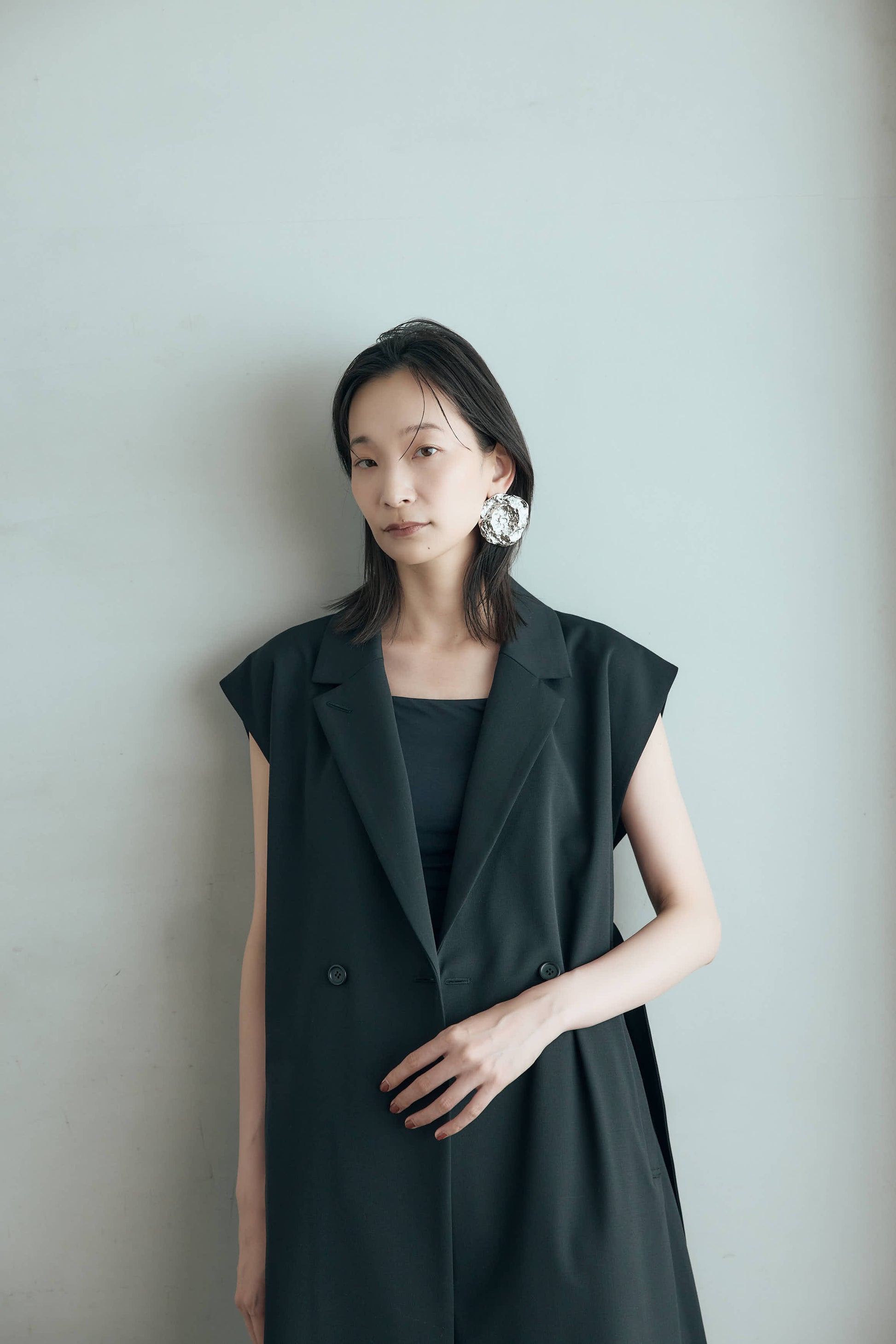 黒のタートルニットやシンプルなシアーインナーと合わせるとシンプルながらも構築的なスタイリングが完成します
