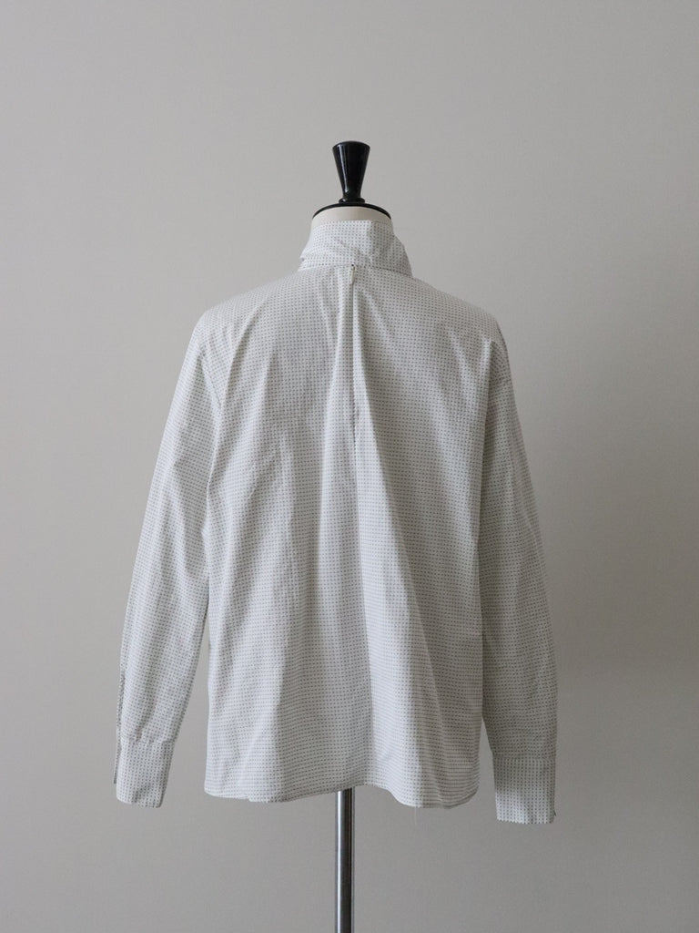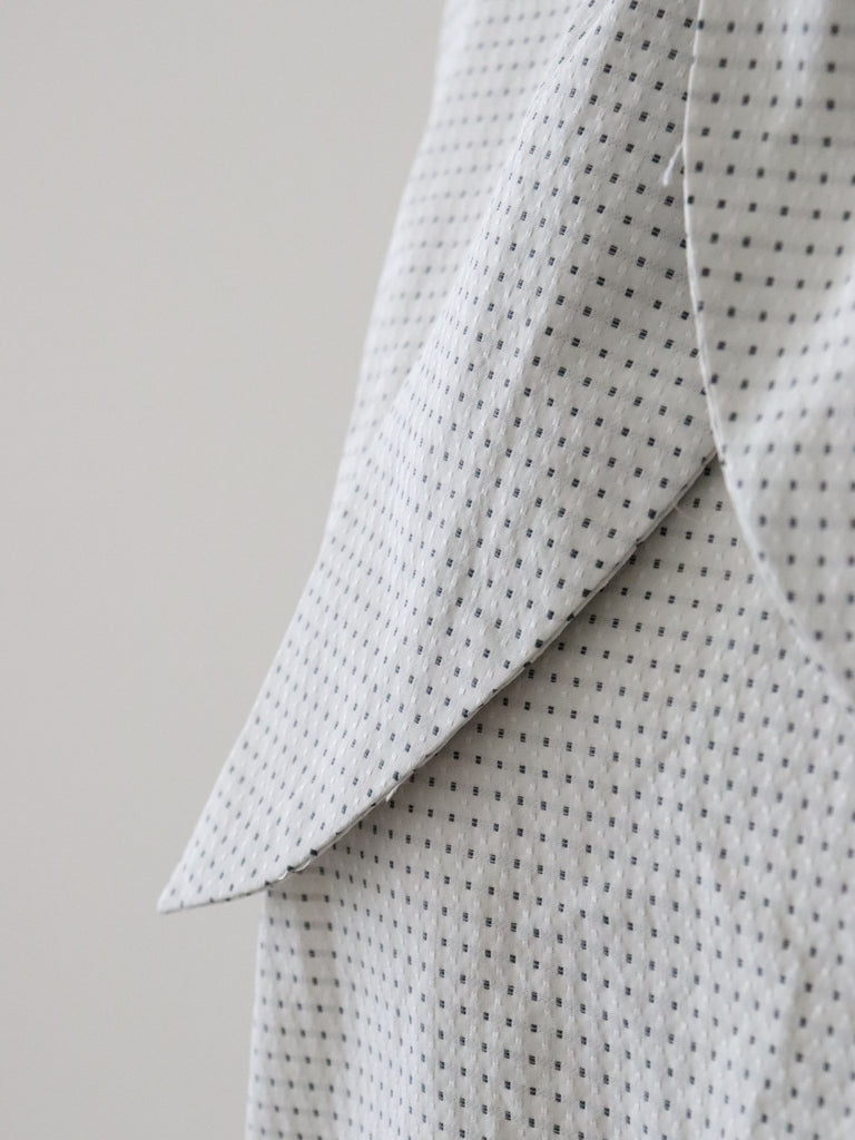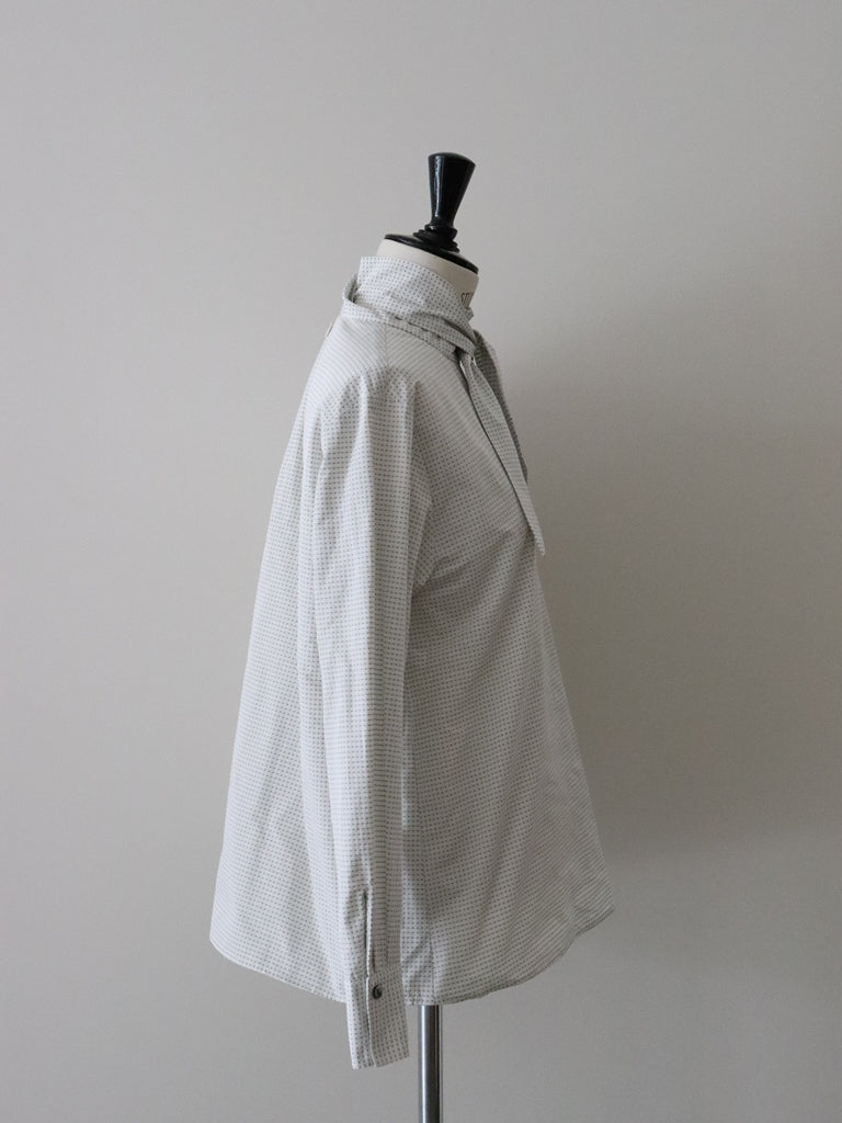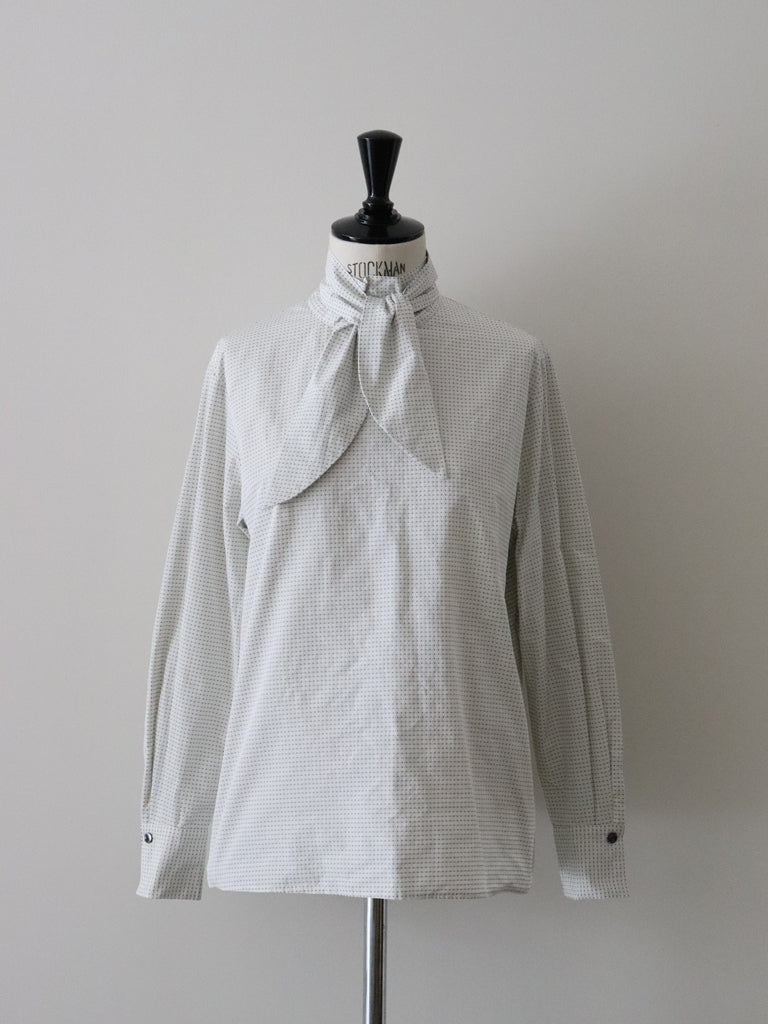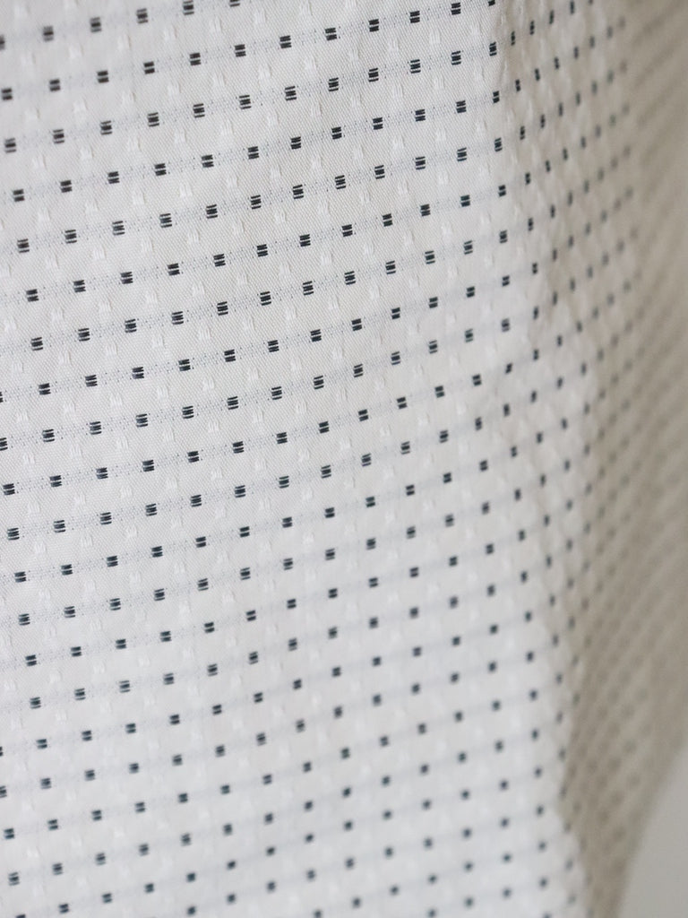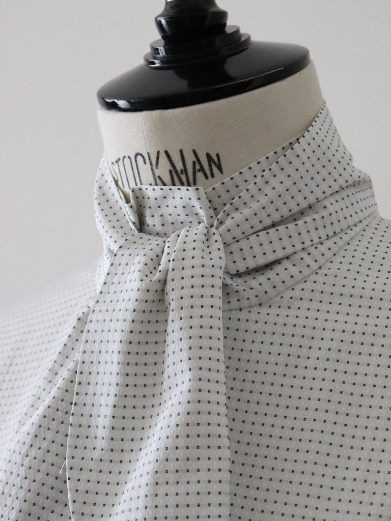 シワになりにくい、マットなポリエステルタフタベースに、リサイクルポリエステルを使い、刺子調に織られたドットボウタイブラウス