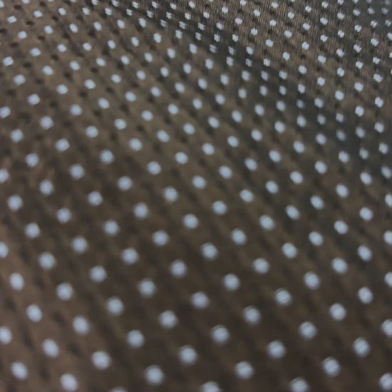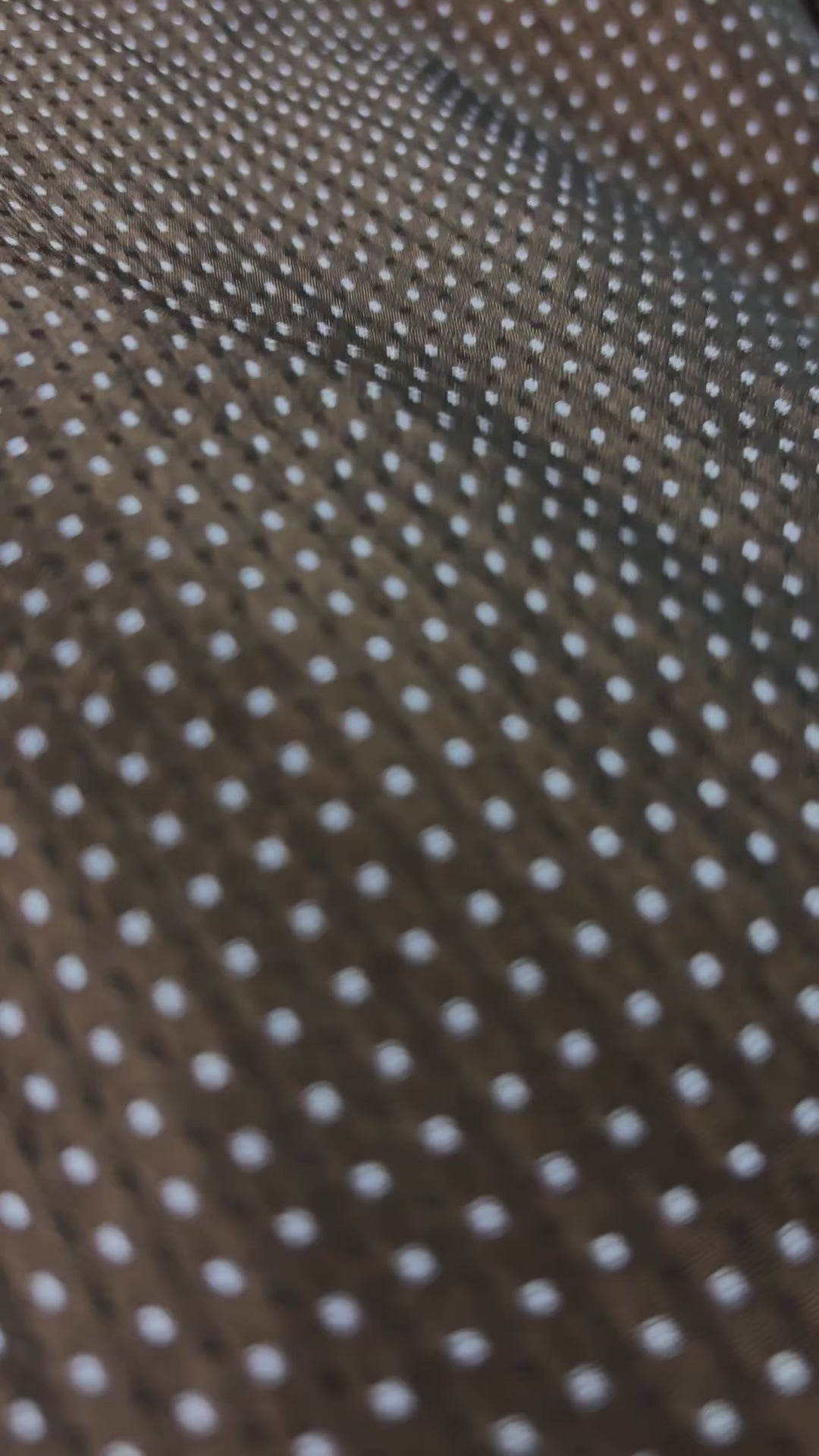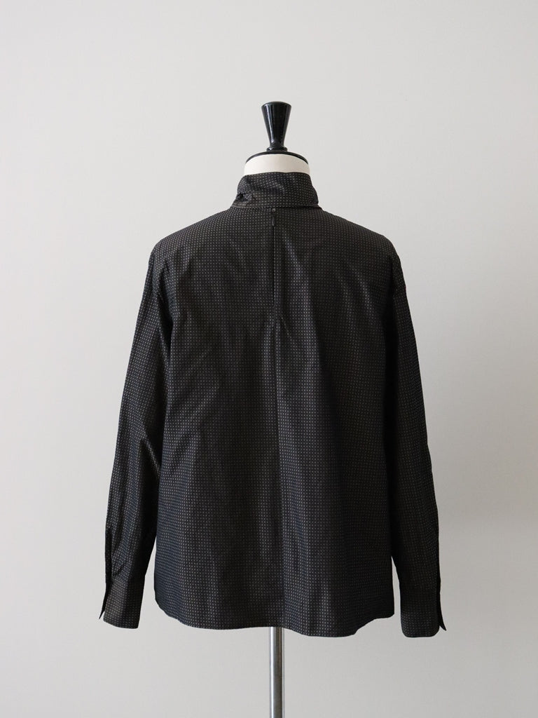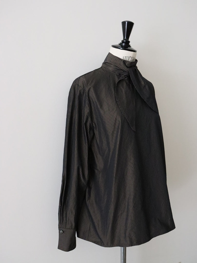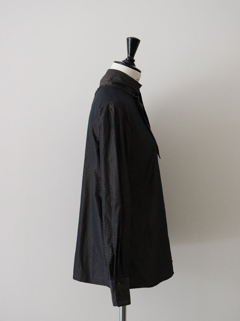 シワになりにくい、マットなポリエステルタフタベースに、リサイクルポリエステルを使い、刺子調に織られたドットボウタイブラウス