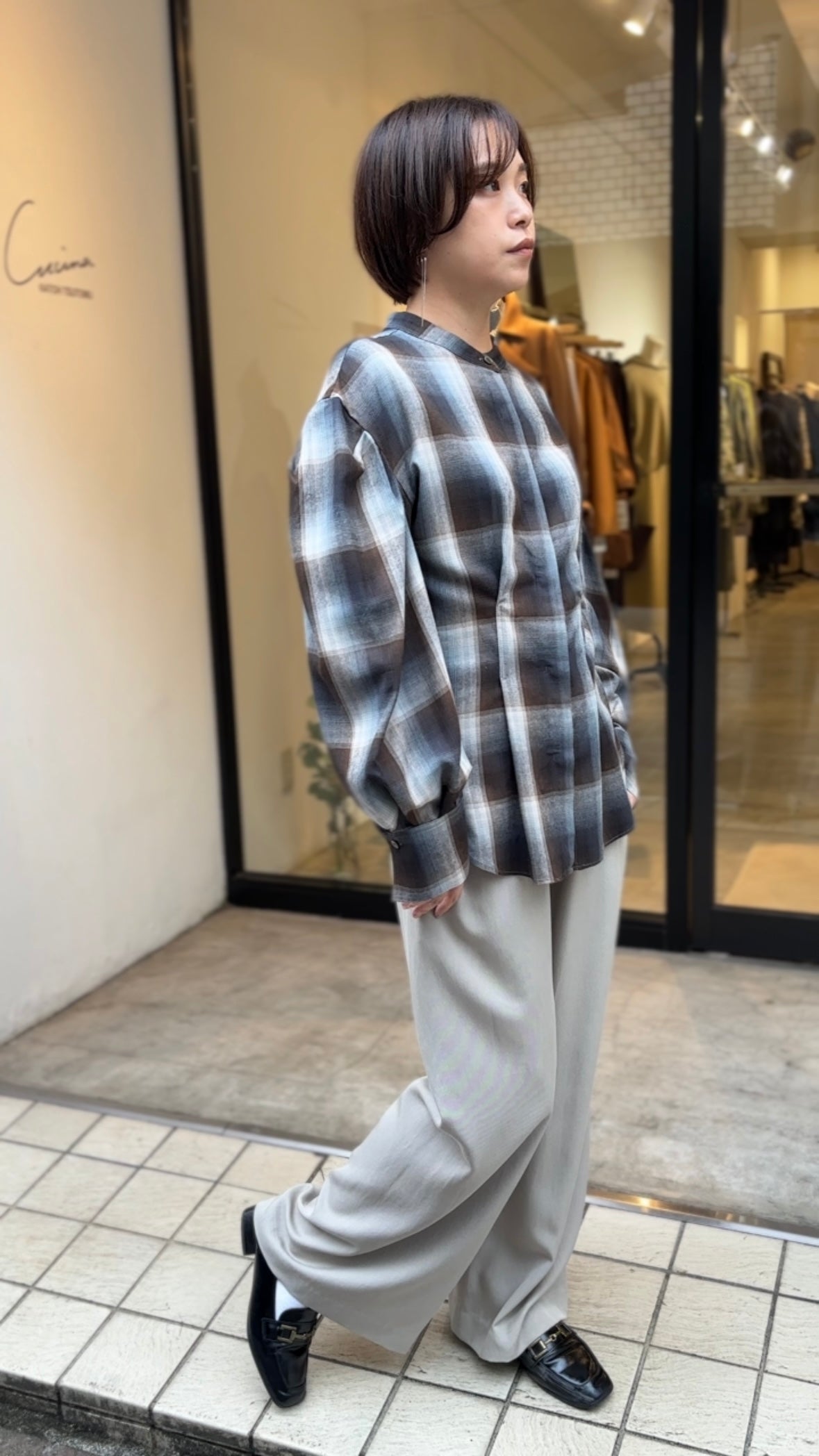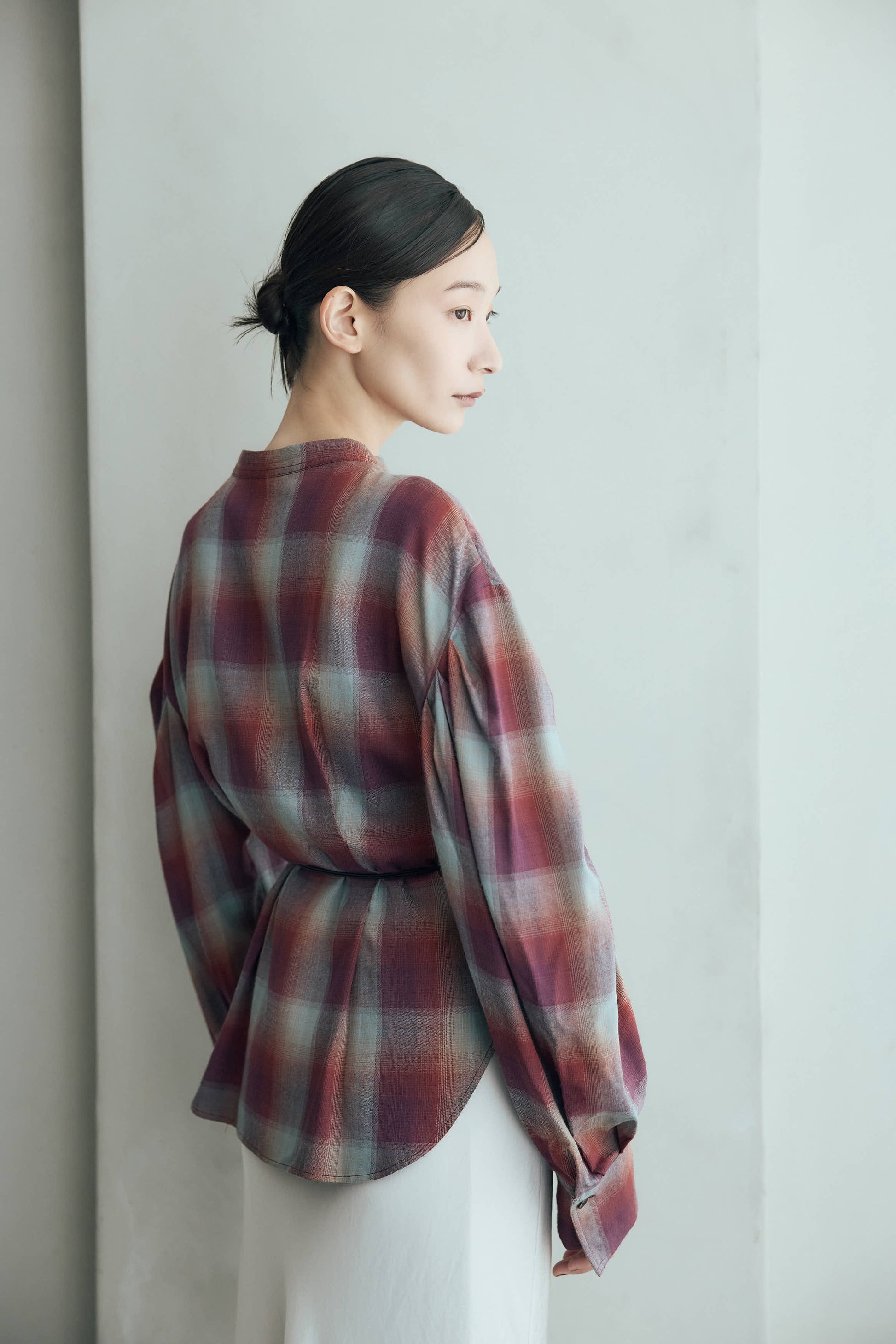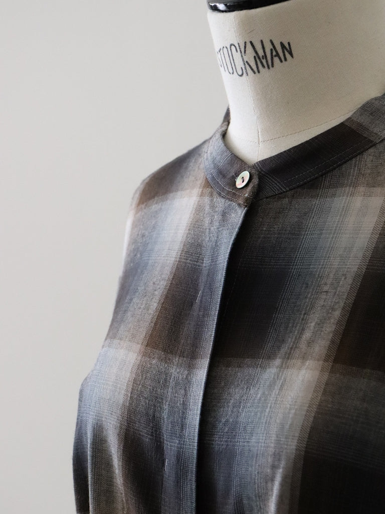 柔らかなニュアンスカラーのチェック柄が目を惹くブラウス