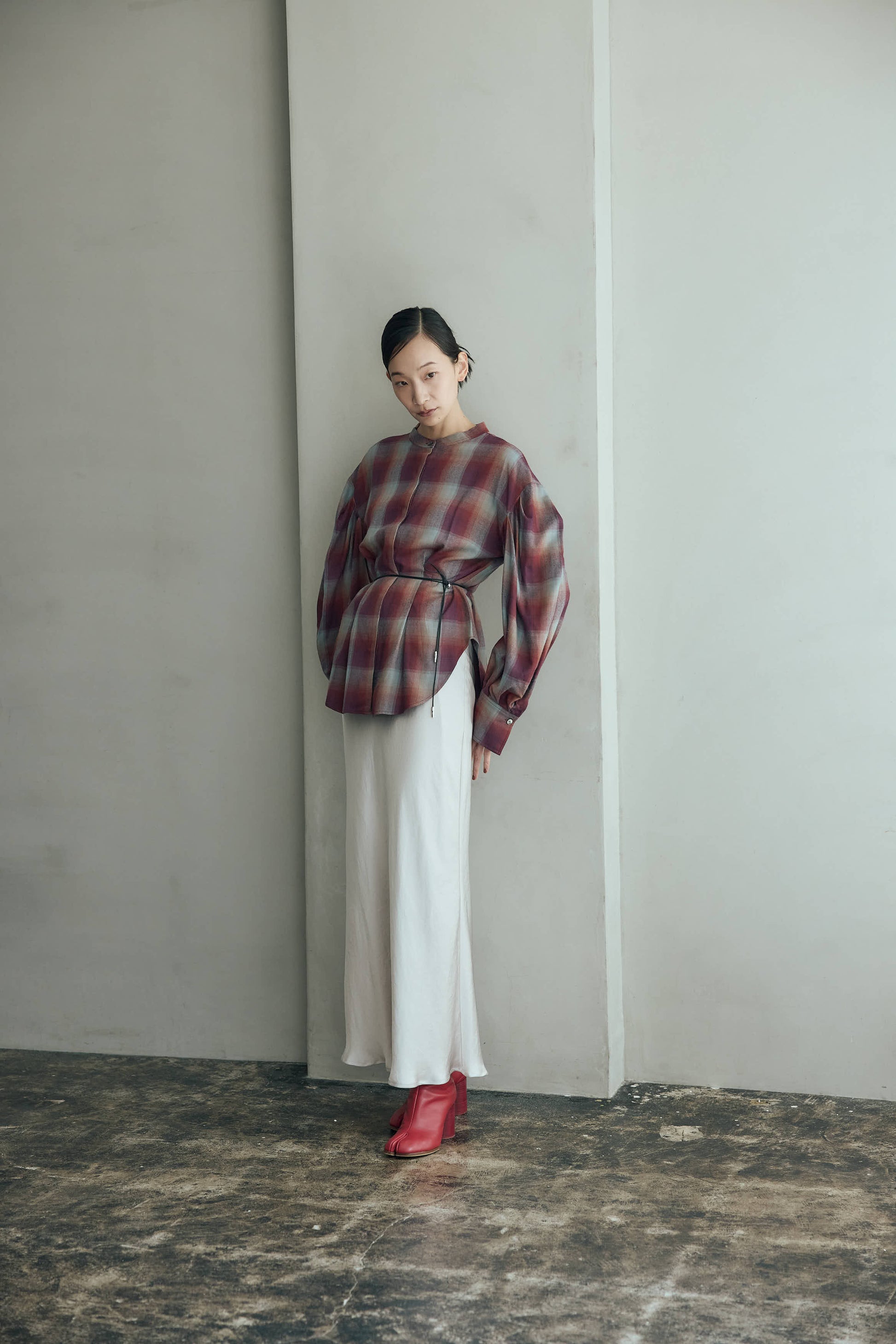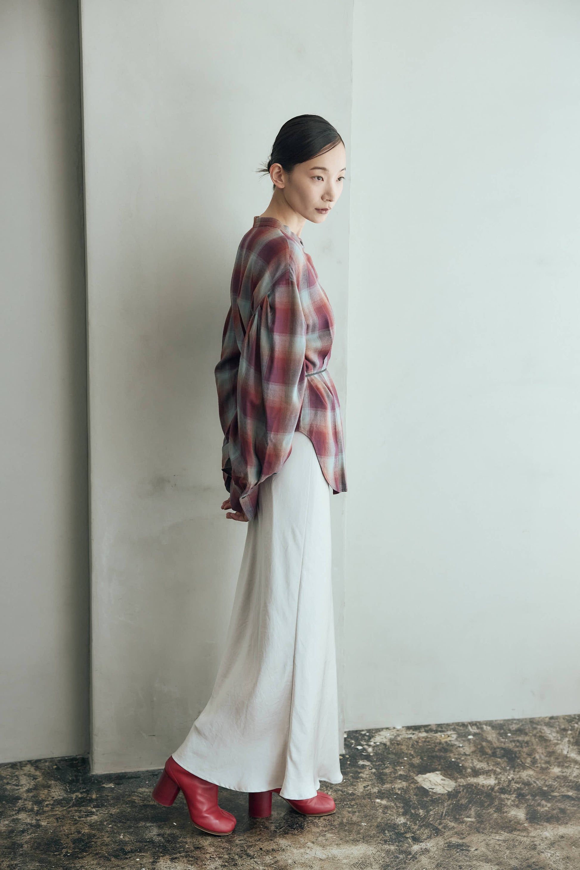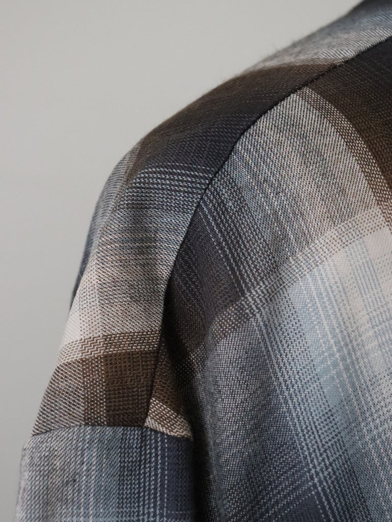 柔らかなニュアンスカラーのチェック柄が目を惹くブラウス
