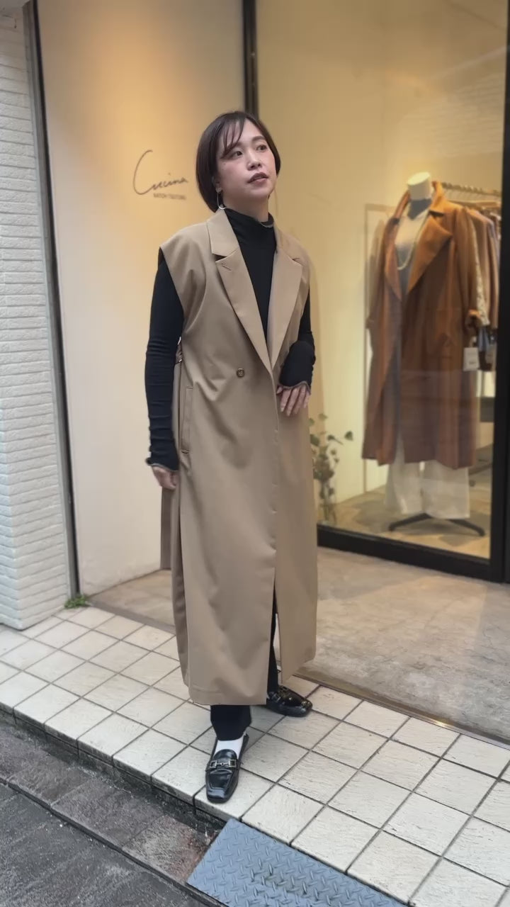 黒のタートルニットやシンプルなシアーインナーと合わせるとシンプルながらも構築的なスタイリングが完成します